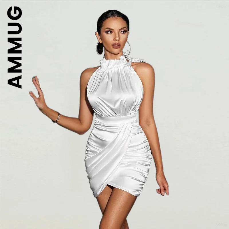 Новое Клубное платье Ammug с рюшами и лямкой на шее, шикарные Простые Вечерние платья, тонкая мягкая женская одежда, женские платья