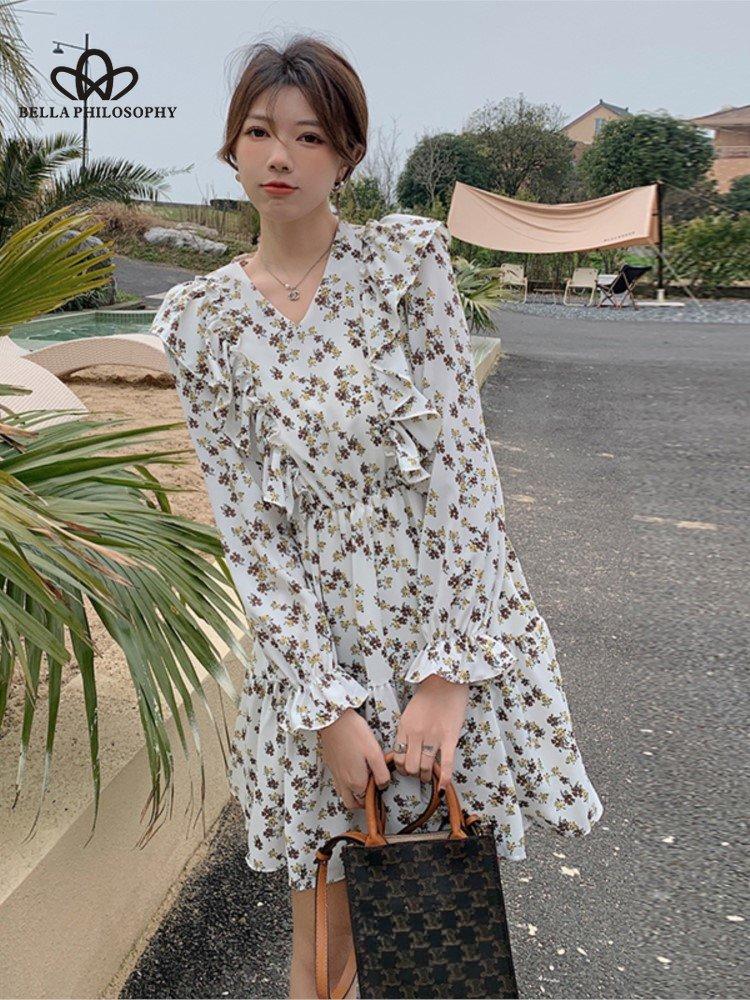 Новое весеннее элегантное шифоновое платье в Корейском стиле с v-образным вырезом и длинными рукавами, с рюшами и цветочным принтом, женское повседневное пляжное платье L белый