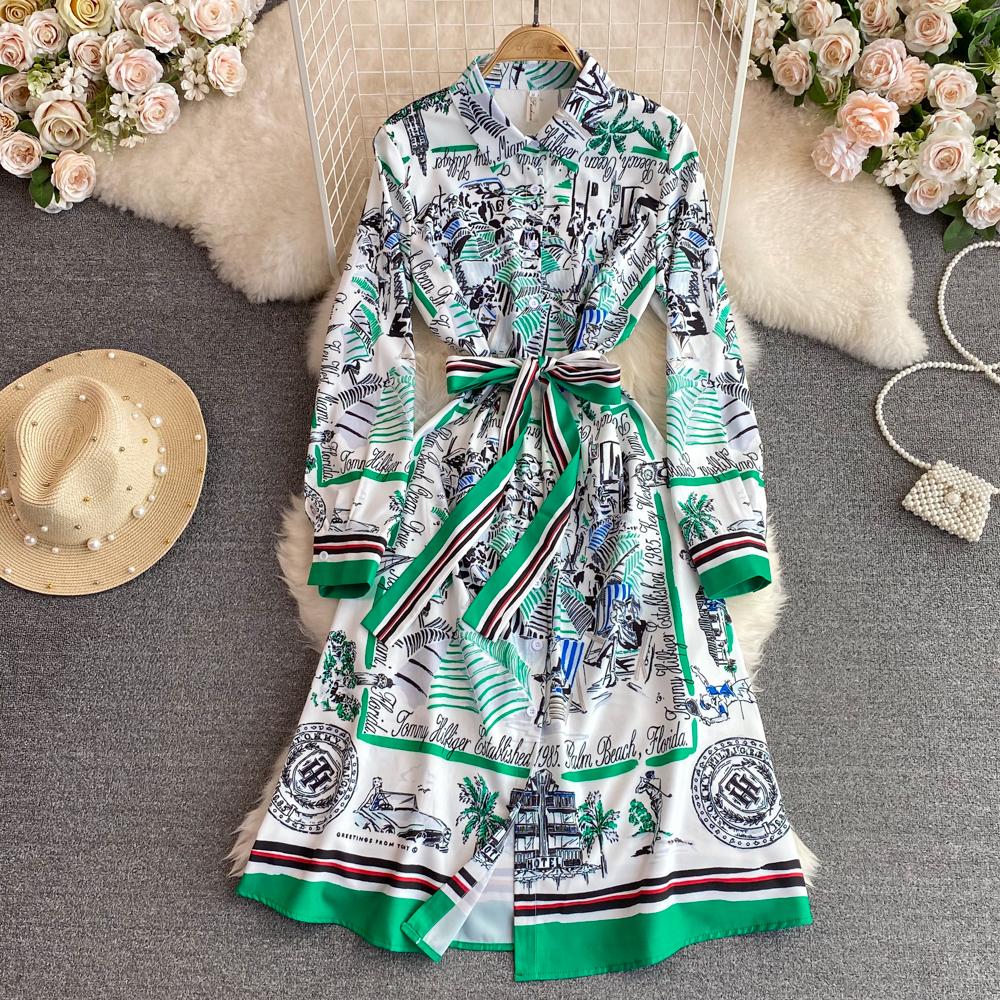 Новое осенне-весеннее платье с принтом для подиума, модные винтажные платья-рубашки с лацканами
