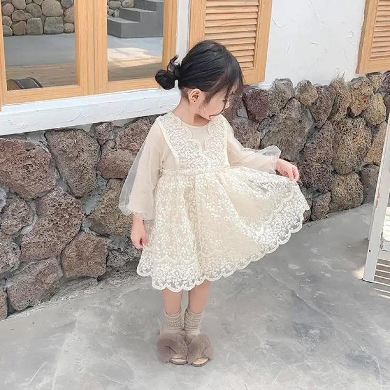 Новое платье принцессы для маленьких девочек коллекция 2022 года, весенне-осеннее милое однотонное платье с кружевной каймой мягкая повседне...
