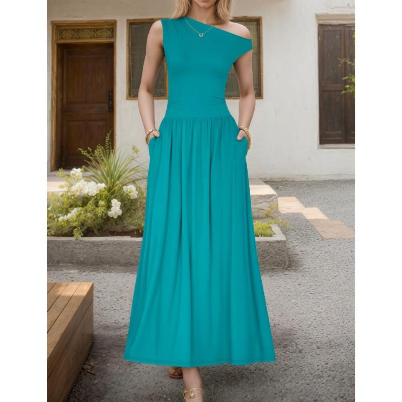 Новое платье этого лета с открытыми плечами и карманами — стильное, облегающее и без рукавов XL синий/зелёный
