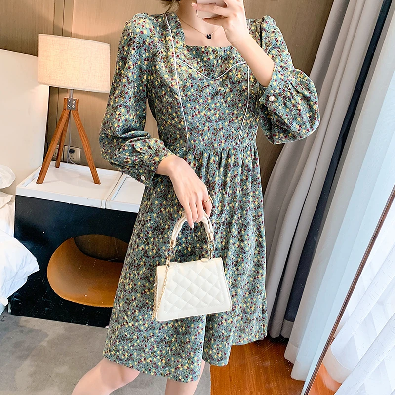 Новое поступление, весенне-осеннее женское вельветовое платье, корейское шикарное свободное зеленое или хаки платье с цветочным принтом, э...