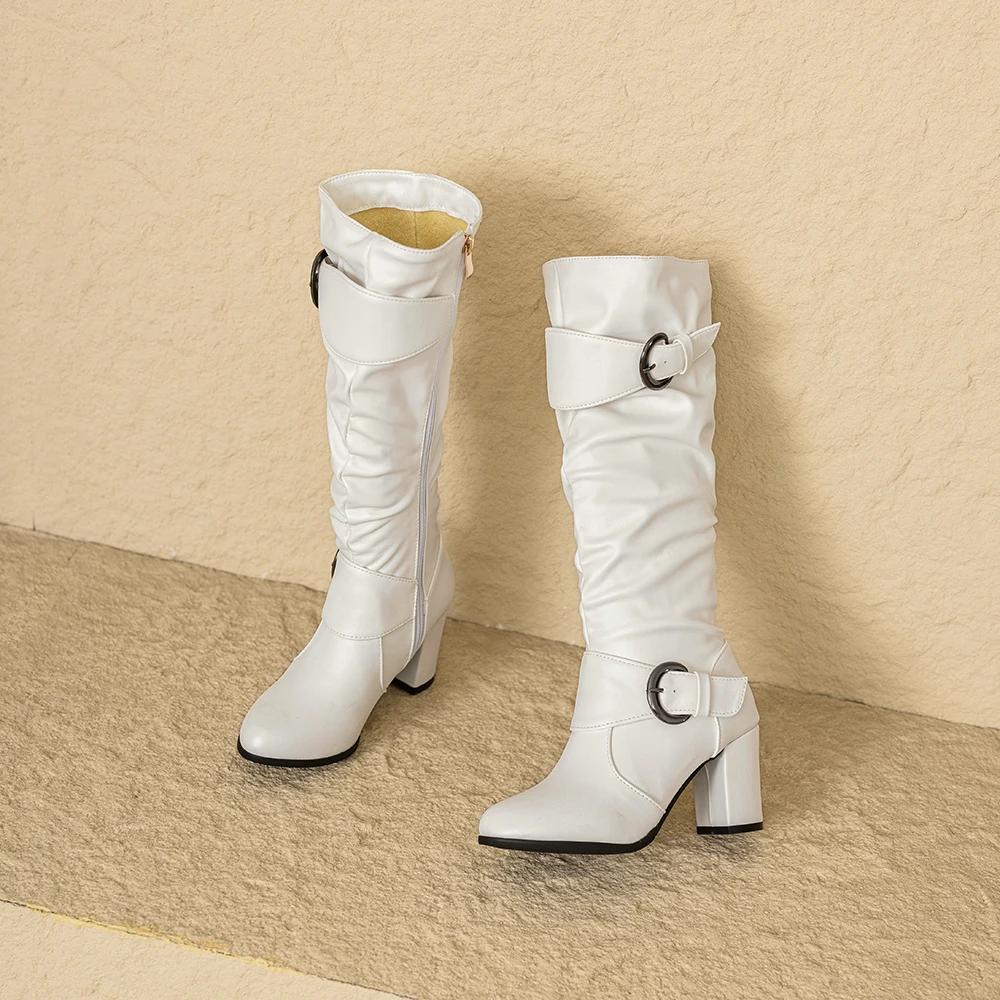 Новые Зимние Милые Черно-Белые Женские Сапоги до Колена Сексуальные Квадратные Высокие Каблуки Женские Сапоги для Верховой Езды Плюс Маленький Большой Размер 37 белый
