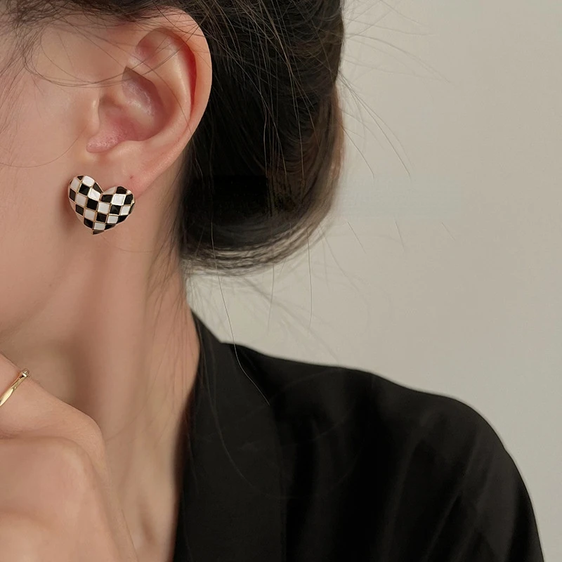 Новые Шахматные черно-белые серьги в форме сердца, капельная глазурь, Женские Ретро повседневные Простые серьги, модные ювелирные изделия д...