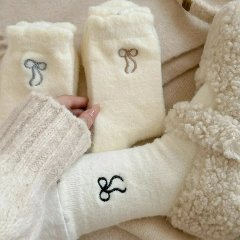 Новые белые бархатные носки премиум-класса с милым бантом, уютные волосатые норковые бархатные носки, осенне-зимние чулочно-носочные изделия, утолщенные плюшевые теплые домашние пушистые носки для сна
