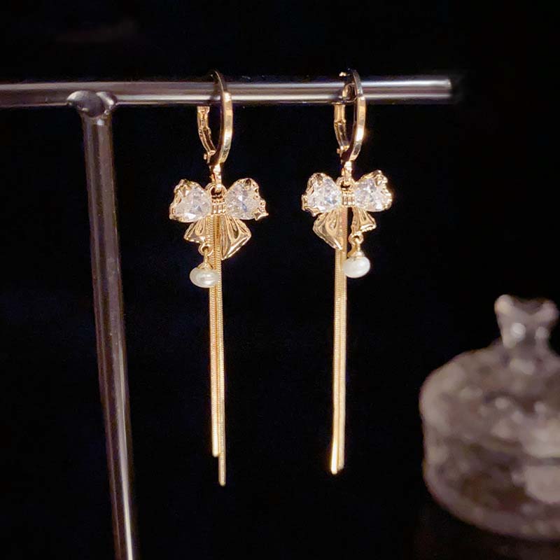 Новые висячие серьги с бантом и цирконием для женщин, золотистая цепочка, серьги-кольца с кисточками, серьги-капли с бантиком CZ, модные ювелирные изделия, подарок для нее