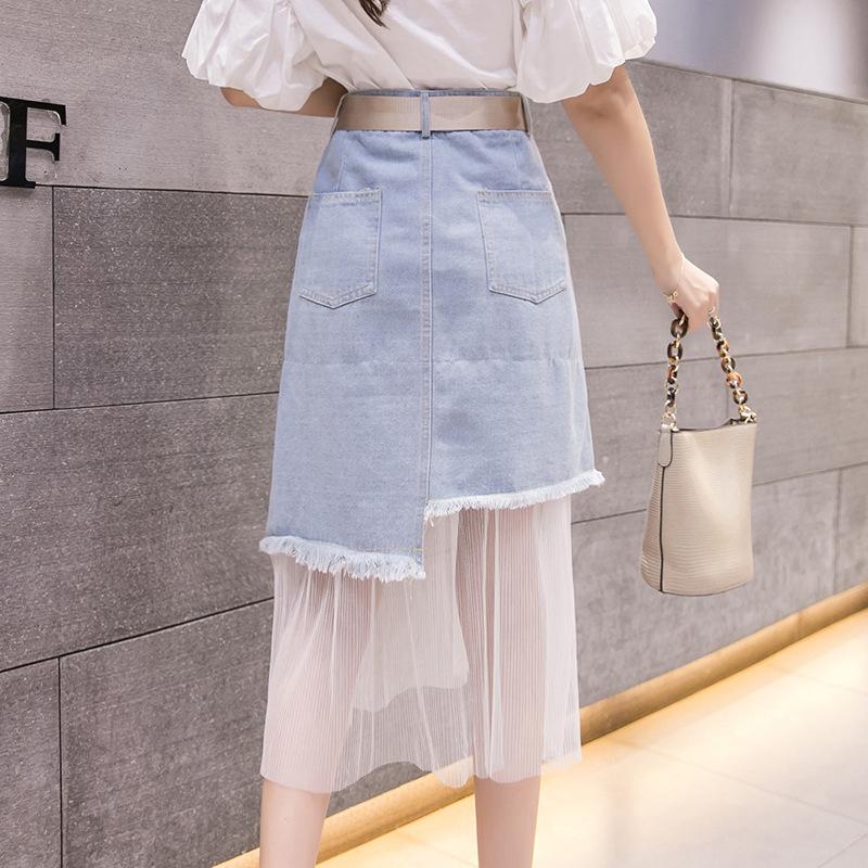 Новые джинсовые юбки с цветной сеткой, рваные края, джинсовые женские юбки нерегулярной формы, асимметричная юбка средней длины с запахом на бедрах XL синий