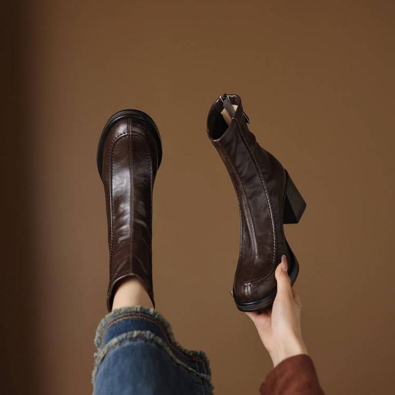 Новые женские кожаные ботинки на платформе и высоком каблуке, однотонные, большого размера, ботинки рыцаря, задняя молния, осенне-зимние кожаные ботинки квадратной и средней формы 40