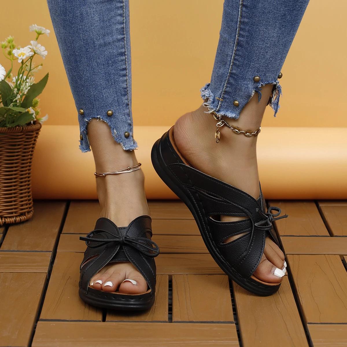 Новые женские тапочки на танкетке, летние повседневные сандалии с вырезами, платформа, открытый носок, шлепанцы, нескользящая пляжная обувь, зеленые шлепанцы 43 чёрный