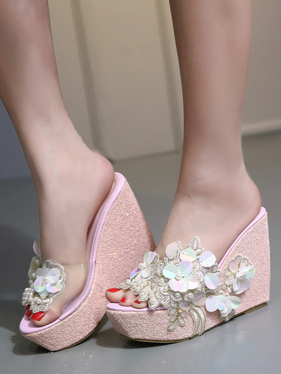 Embroidery Chunky Platform Slippers Women Open Toe Wedges High Heel Sandals Woman Comfort Thick Bottom Slides Ladies