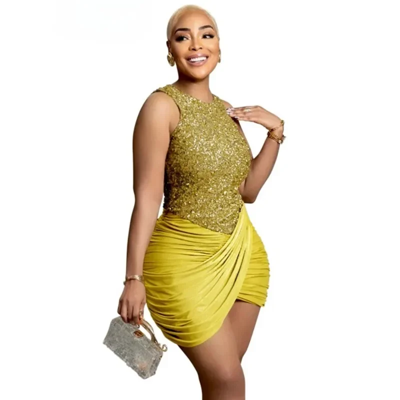Новые модные желтые блестки в стиле пэчворк, нерегулярные облегающие платья с рюшами для дня рождения, клубные платья для женщин, вечерние платья без рукавов с круглым вырезом