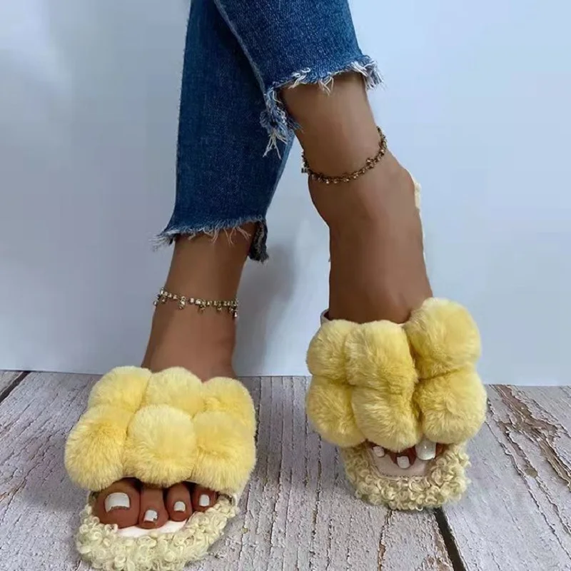 Новые модные пушистые тапочки с помпоном для осени/зимы, хлопковые тапочки на плоской подошве, Женская плюшевая обувь, меховые шлепанцы с по...