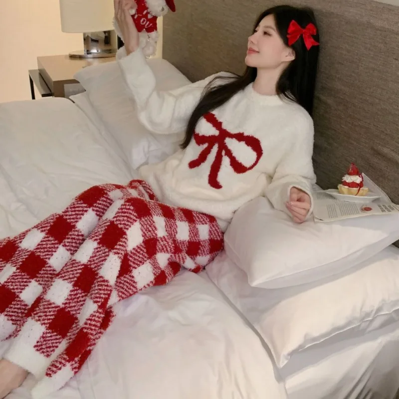 Новые осенне-зимние женские пижамы, красная клетчатая бархатная домашняя одежда, мягкая утолщенная теплая одежда для сна в Корейском стиле для девочек, рождественская милая одежда больших размеров