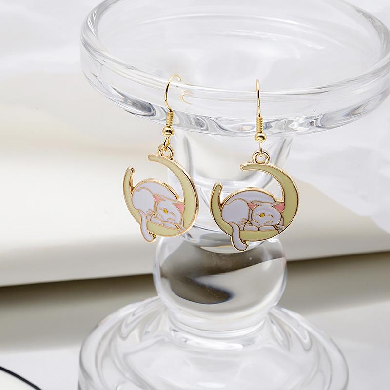 Новые серьги с лежачими лунными котами и звездами, узкие ушные крючки для лица, милые аксессуары для ушей с героями мультфильмов для девочек золотой