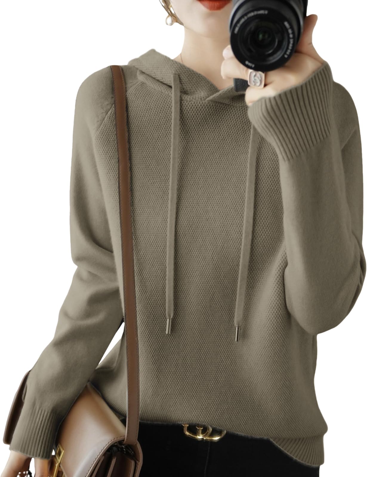 Новый Худи с капюшоном Длинный Однотонный Стильный Вязаный Простой Для холодной погоды Взрослый Уличный Длинный Короткий С круглым вырезом Свободный Женский Худи, Рукав, Простой, Цветной, Повседневный, Топ, бежевый