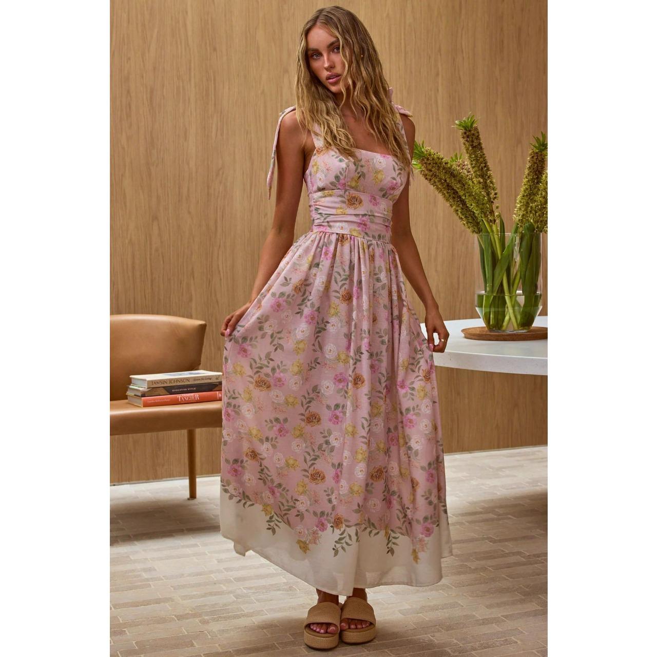 Новый летний стиль отпуска Французское цветочное платье-халтер с завязками на талии, стройнящее, с цветовыми блоками XL розовый