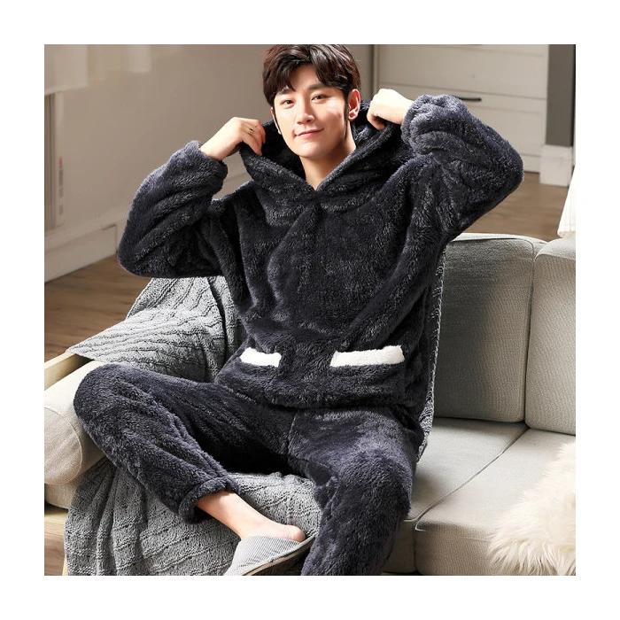 Новый мужской зимний утолщенный коралловый флисовый пижамный комплект, плюшевый домашний костюм с капюшоном, длинный рукав, мультяшный фланель, комплект из 2 предметов, теплая ночная рубашка, размер плюс 3XL 4XL 4XL