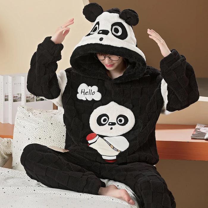 Новый мужской зимний утолщенный пижамный комплект из кораллового флиса, плюшевый домашний костюм с капюшоном, длинный рукав, мультяшный фланель, комплект из 2 предметов, теплая ночная рубашка, большой размер 3XL 4XL 4XL