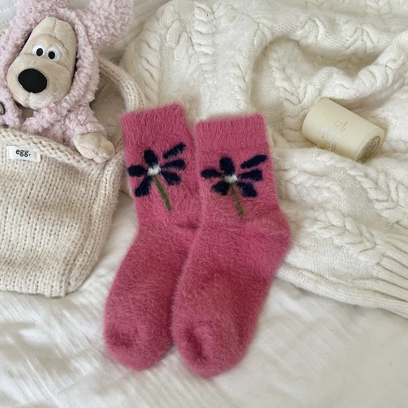 Норковый мех Маленький цветок Милые Домашние Флисовые Теплые Гольфы до середины икры Женские, Женские Осенне-зимние Утепленные Снежные Мохеровые Носки 1 pair розовый