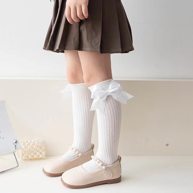 Носки для девочек с жемчужным большим бантом, милые носки принцессы из телячьей кожи, детские носки из чесаного хлопка, для малышей и младенцев, до колена one size белый