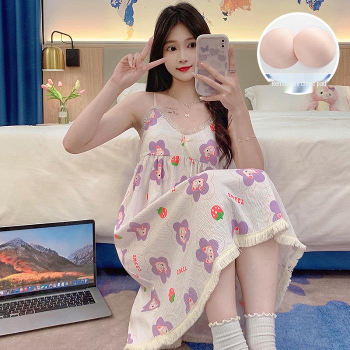 Ночная рубашка из хлопка с V-образным вырезом и накладкой на грудь 2024 года — женская пижама с юбкой на подтяжках в милом стиле Medium