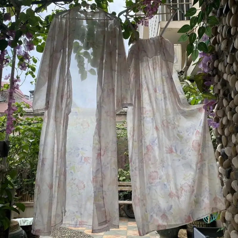 Ночная рубашка, комплект из 2 предметов, сексуальное шелковистое прозрачное платье на подтяжках, халат с длинными рукавами, прозрачный шелковый тюль с цветочным принтом, халат для сна для пары