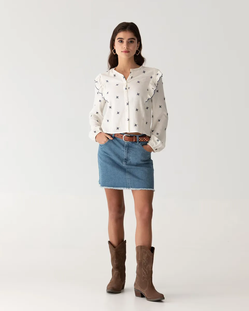 FASHOR White Floral Embroidered Schiffili Work Bell Sleeve Fit & Flare Cotton Ethnic Dress