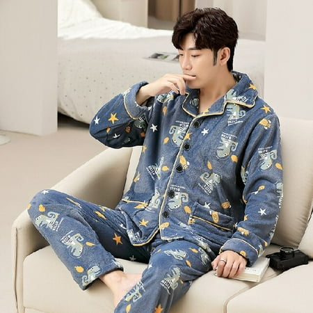 DanceeMangoo Long Sleeve Winter Thicken Warm Flannel Men Pajamas Sets Leisure Print Father Sleepwear 3XL 4XL 5XL 95kg Nightwear Male Pajama