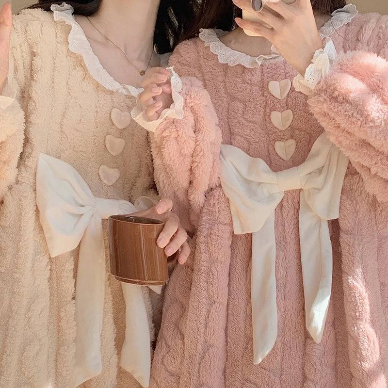 Ночные рубашки из кораллового флиса, Женская кружевная Милая домашняя одежда в стиле пэчворк для девочек, одежда для сна, длинная ночная рубашка с бантом, Повседневная Утепленная зимняя Милая