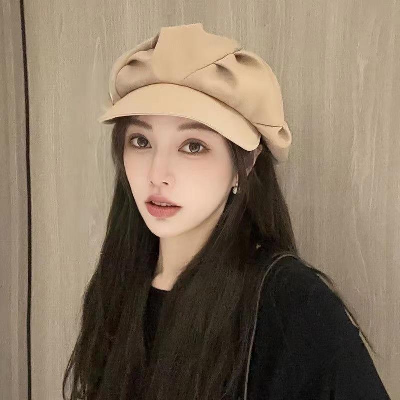 Облачная шляпа, Женская, Мятая, Закрывающая лицо, Маленькое лицо, Восьмиугольная шляпа, Для повседневных поездок, Повседневная корейская версия, Берет с коротким козырьком Adjustable (54cm-58cm) хаки