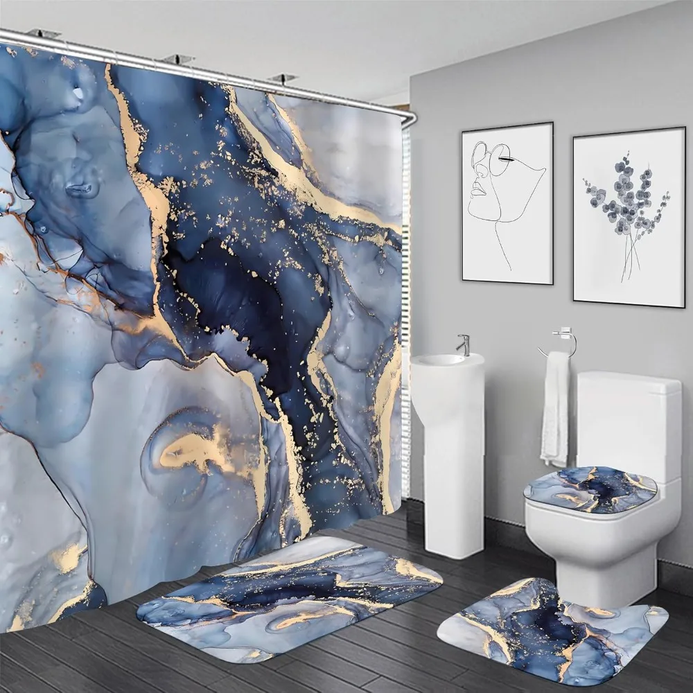 4-х шт. синий мраморный набор занавесок для душа, современные абстрактные наборы для ванной комнаты с занавеской для душа и ковриками, золотые тканевые занавески для душа для