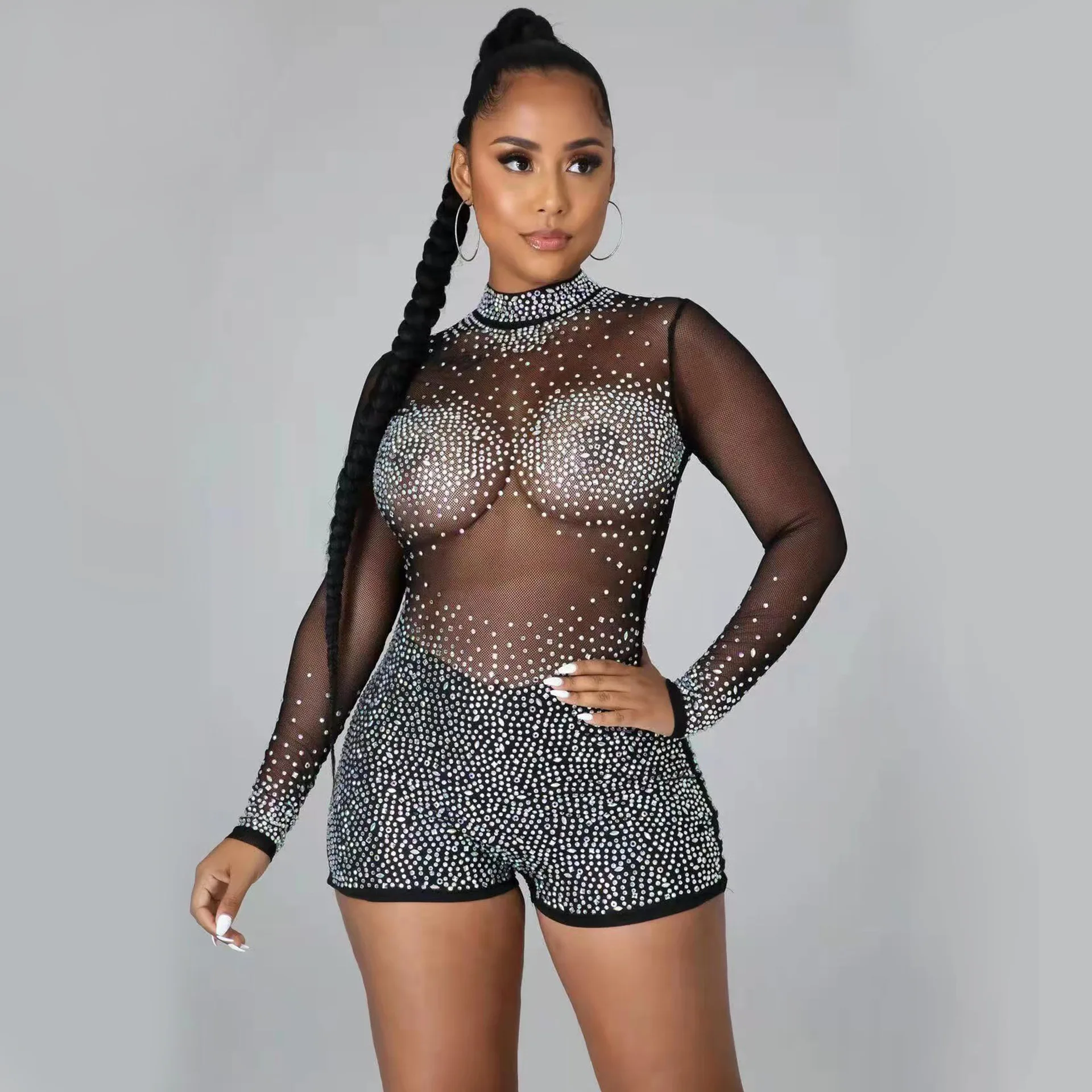 Sparkle Rhinestones Mesh Rompers Womens Jumpsuit Sexy Birthday Club Outfits Long Sleeve Bodycon Playsuits Dropshipping
