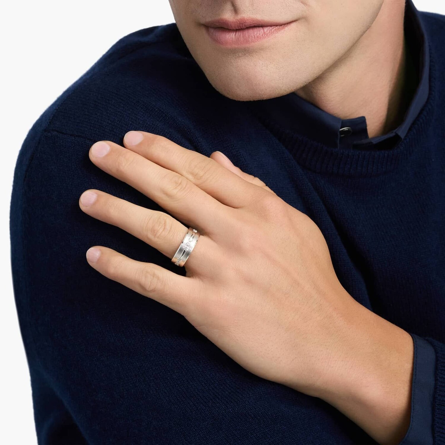 Бриллианты собраны по три на этом обручальном кольце из 14-каратного белого золота с центральной канавкой, выложенной камнями в желобчатой оправе.