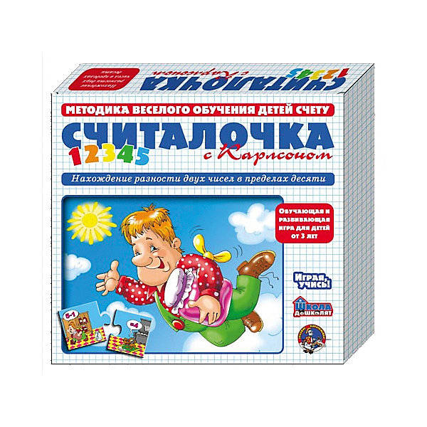 Игра развивающая Считалочка «С Карлсоном» включает в свой состав 20 мини-пазлов, на правой половине которых находятся уменьшаемое и вычитаемое, а на второй — их разность. Кроме того, на элементах игры располагаются веселые красочные картинки с персонажами известной детской книжки о человечке, живущем на крыше. Правильно совмещая кусочки мини-пазлов, ребенок в игровой форме познакомится с таким арифметическим действием, как вычитание.