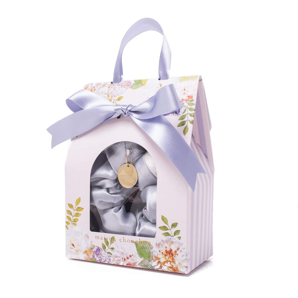 Ограниченный выпуск двухцветной атласной резинки для волос с цветочным узором, подарочная коробка с инициалами, золотая пластина [Ailey Illy] (Пепельно-серый) (Пепельно-серый) (Алфавит Е)