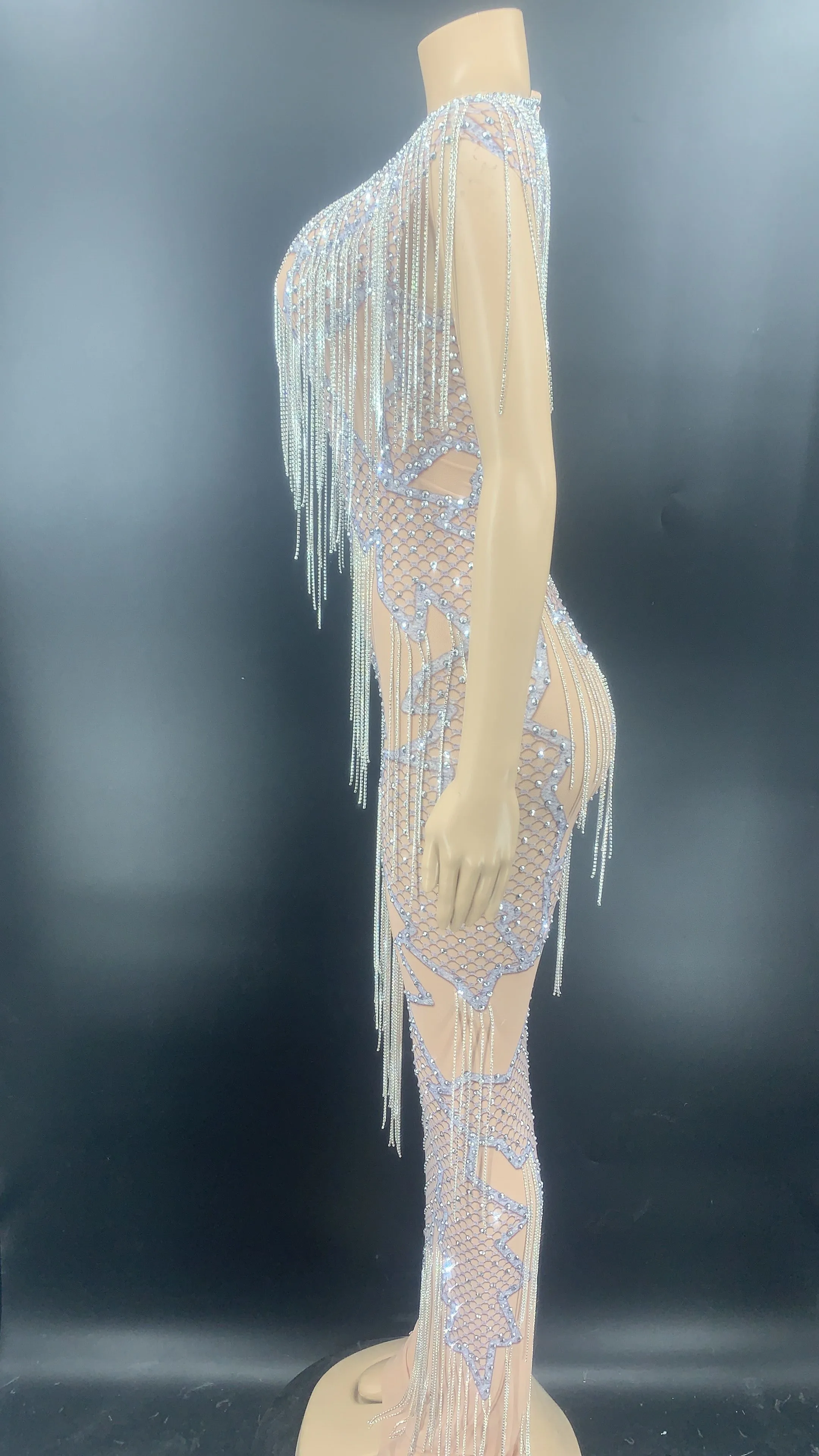 Одиночный рукав Серебряные Камни; С бахромой; Сетчатое платье для дня рождения и выпускного вечера праздновать наряд певица DJ яркое длинное...