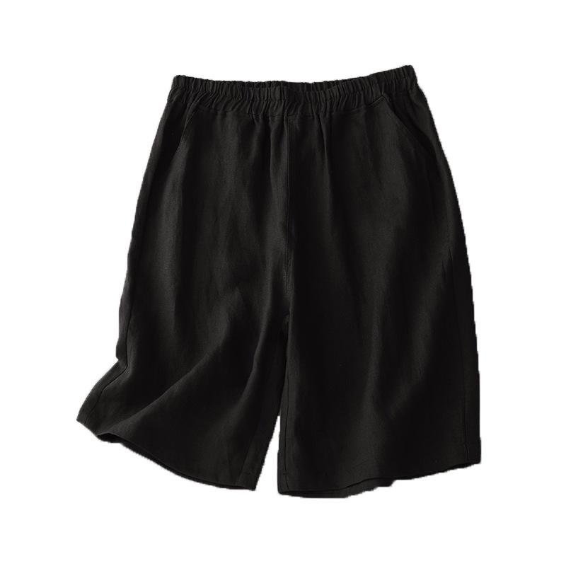 Однотонные хлопково-льняные бриджи с широкими штанинами женские 2025 лето новые литературные и ретро эластичная талия темпераментные повседневные шорты 3XL чёрный