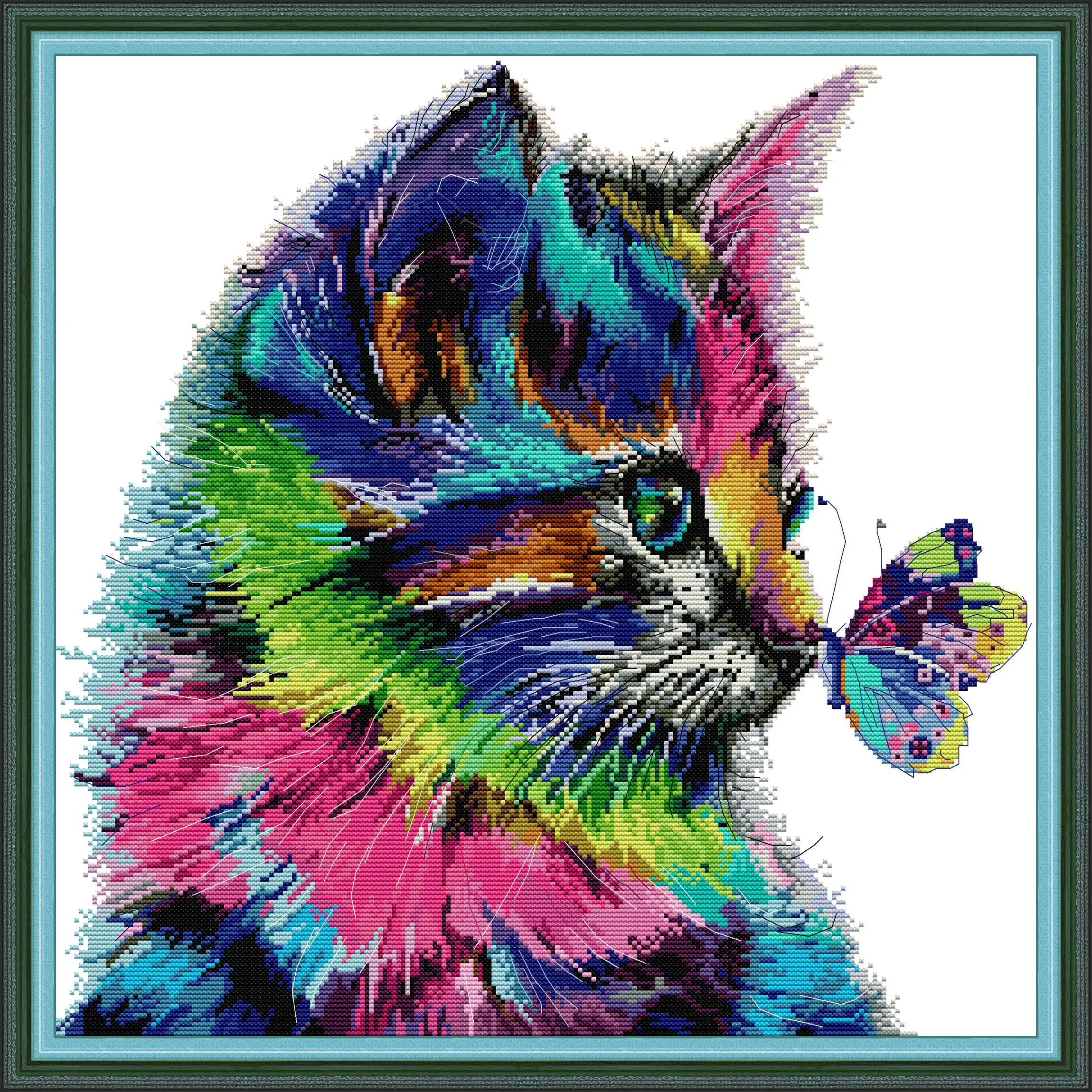 Joy Sunday Pre-printed Cross Stitch Kit Easy Pattern Aida Stamped Fabric Embroidery Set-Rainbow Cat