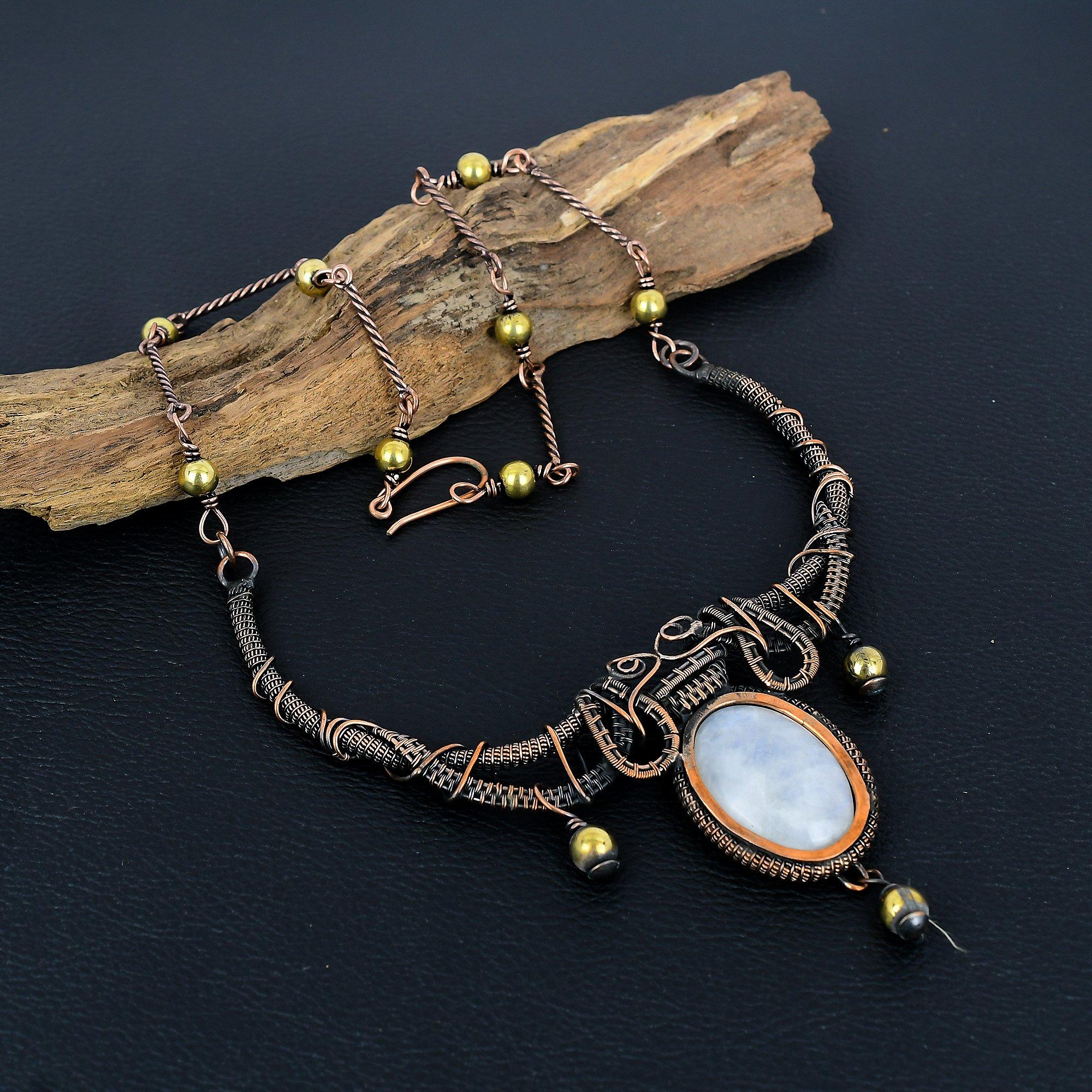 Ожерелье из радужного лунного камня, обернутое медной проволокой 999 пробы, регулируемое, цепочка, ожерелье из драгоценного камня ручной работы, подарок для мамы, антикварные украшения