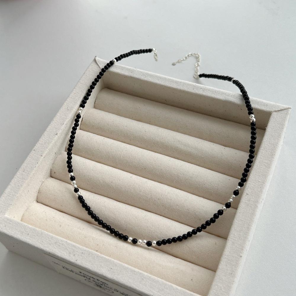 Ожерелье из серебра 925 пробы с натуральным черным агатом и бисером Модная универсальная цепочка с двумя ключицами