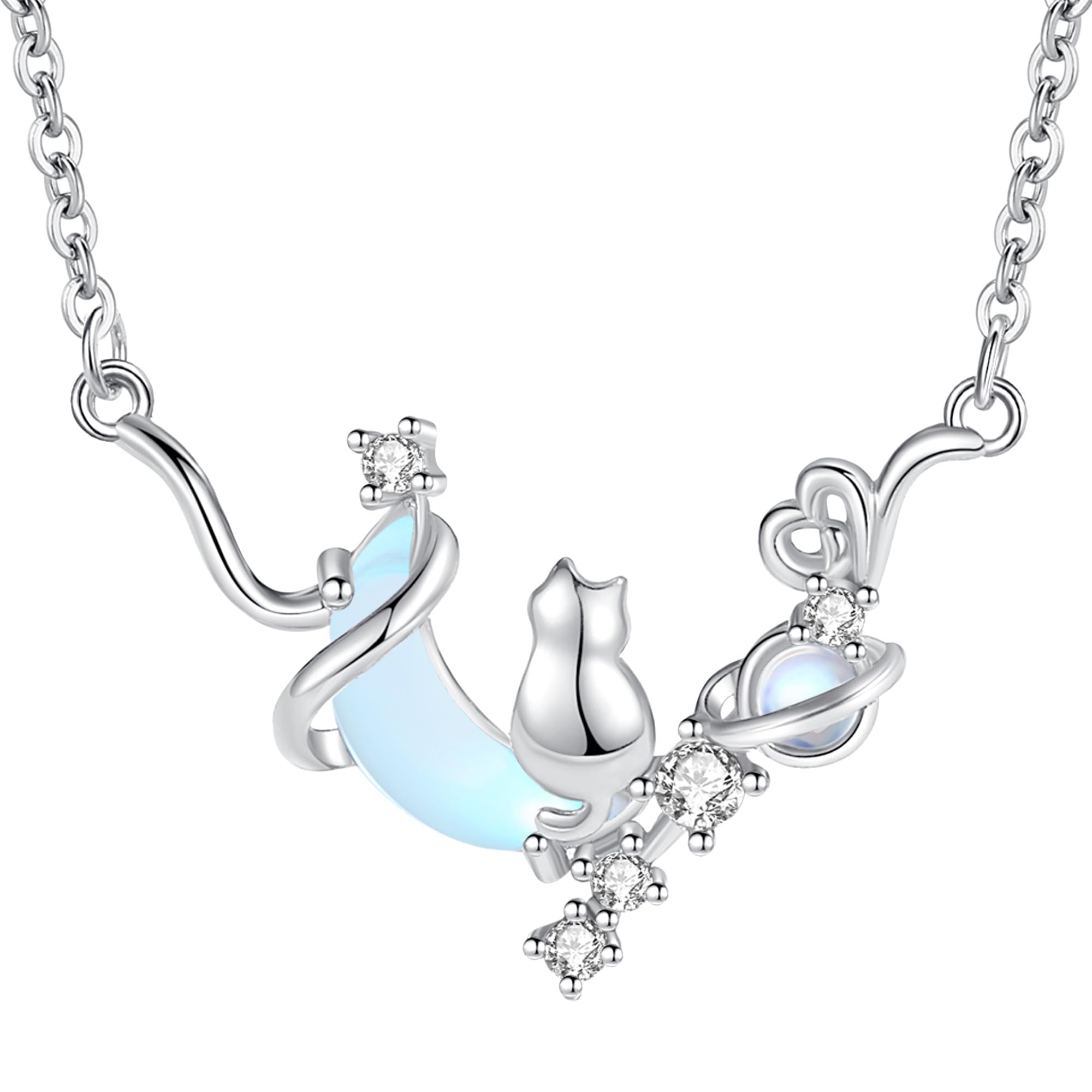 Ожерелье с изображением кошки и луны, мотив лунного камня, серебро 925 пробы, совместимое с золотом, милое ожерелье с кошкой, популярный подарок для выпускных церемоний Серебряный гром