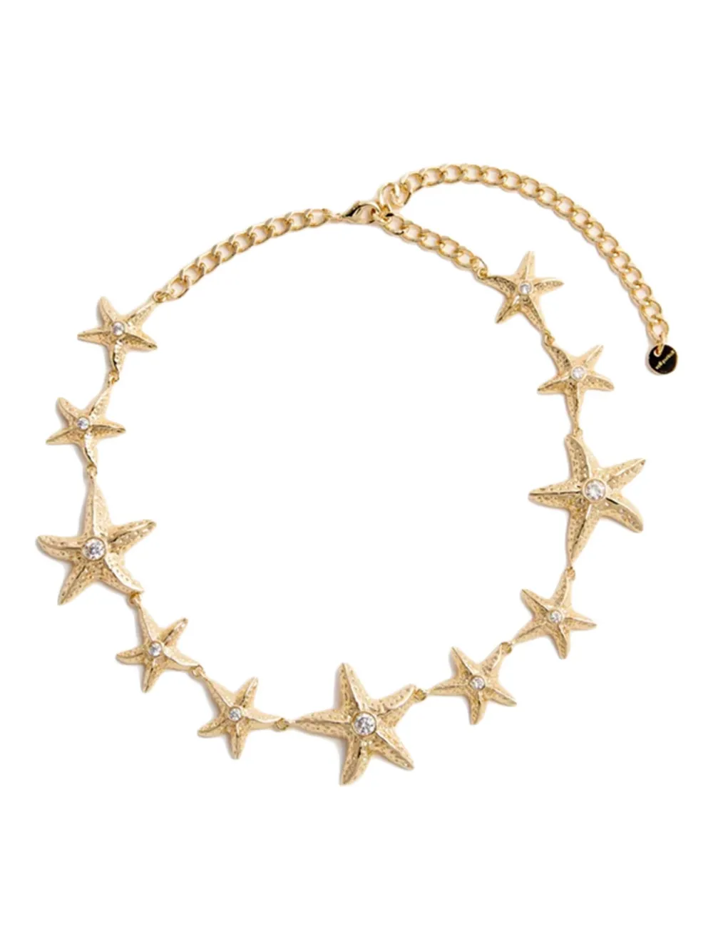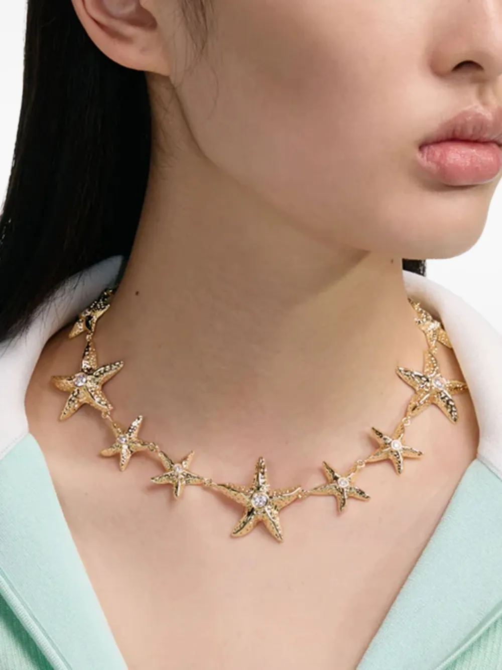 Золотистый цвет, молотковая текстура, мотив морской звезды, украшение кристаллами, застежка-пряжка. Обычное повседневное использование и внешние факторы могут снизить блеск драгоценных камней и золотых поверхностей. Для ухода используйте специальные неабразивные средства, предназначенные для чистки ювелирных изделий.