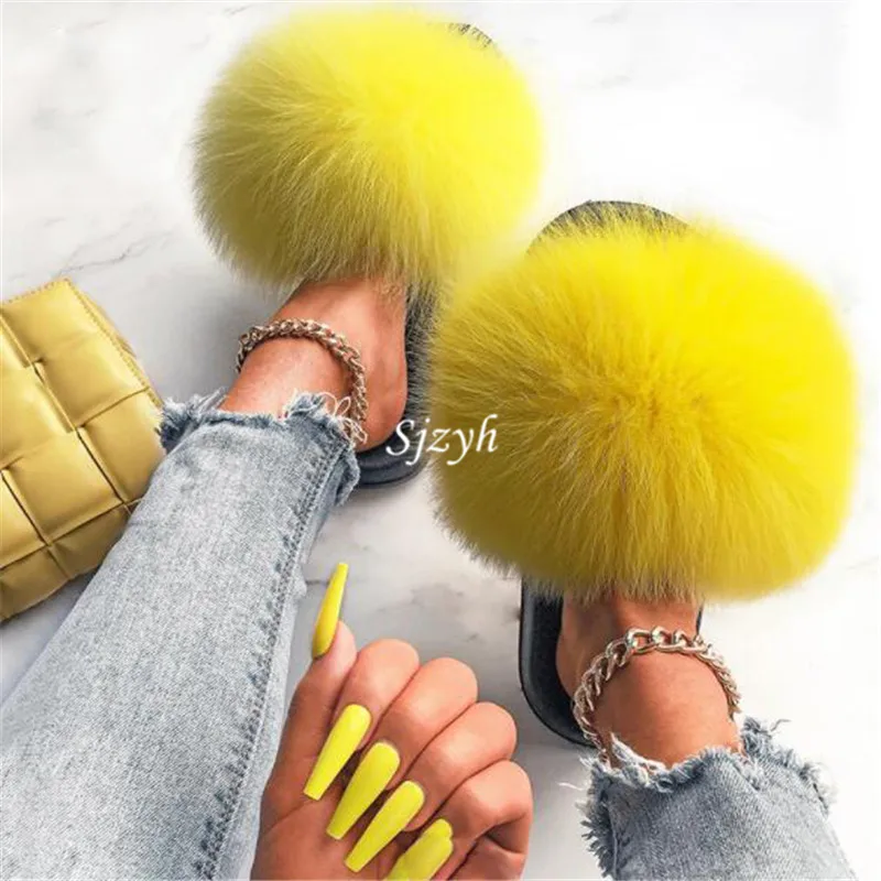 Оптовая продажа, зимние женские меховые тапочки из лисьего меха, пушистые меховые шлепанцы, домашняя теплая обувь, женские меховые сланцы, ж...