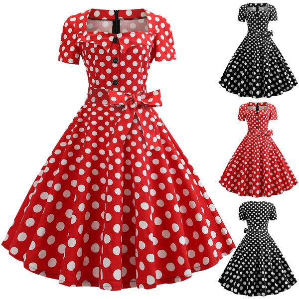 Women dress Summer Vintage Short Sleeve Dot Printing Elegant dresses Fashion button bow bandage Party Prom Swing Dress vestidos