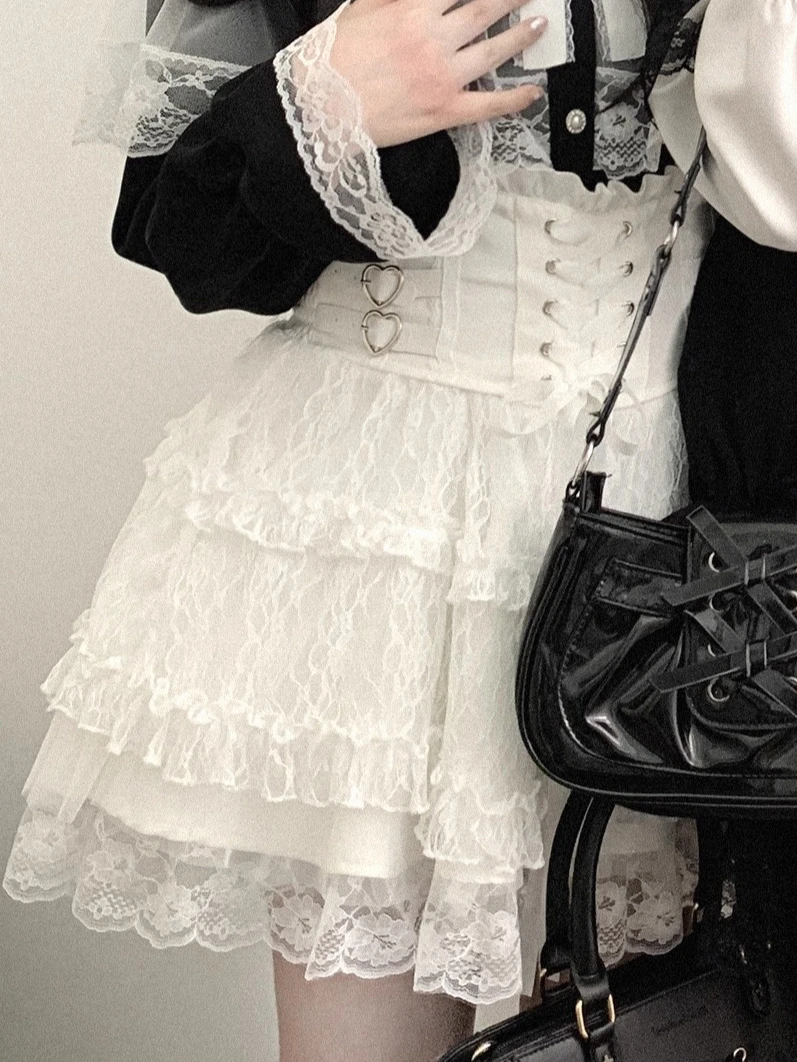 Оригинальная милая кружевная лоскутная тонкая многослойная мини-юбка с высокой талией, женская японская милая двубортная пышная юбка с рюшами