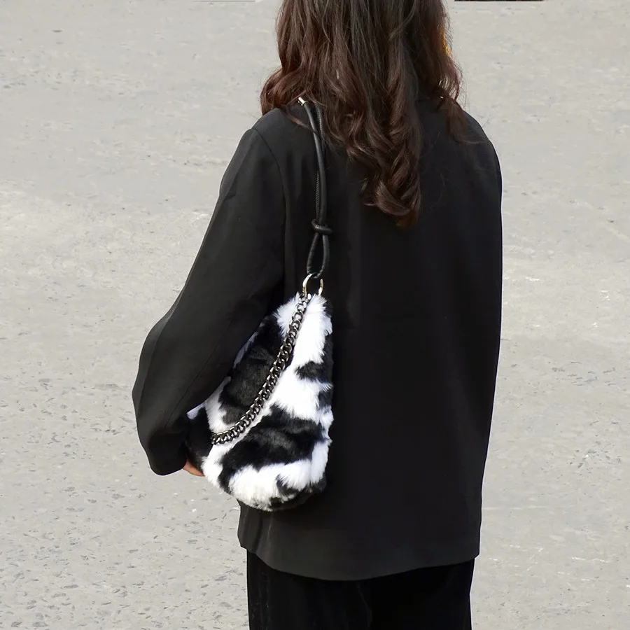 Оригинальная пушистая сумка, длинная черно-белая сумка, нишевая сумка для подмышек, популярная женская сумка через плечо, женская мода