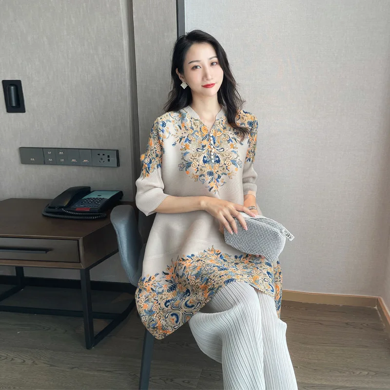 Оригинальное плиссированное платье миаке в ретро стиле, свободное платье-Ципао с пряжкой и V-образным вырезом, свободная широкая юбка больш...