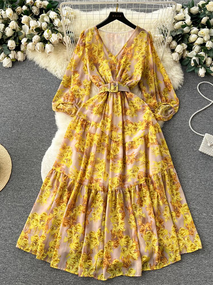 Осеннее винтажное женское платье миди с цветочным принтом, элегантное платье трапециевидной формы с v-образным вырезом и длинными рукавами и рюшами по подолу для женщин One Size жёлтый