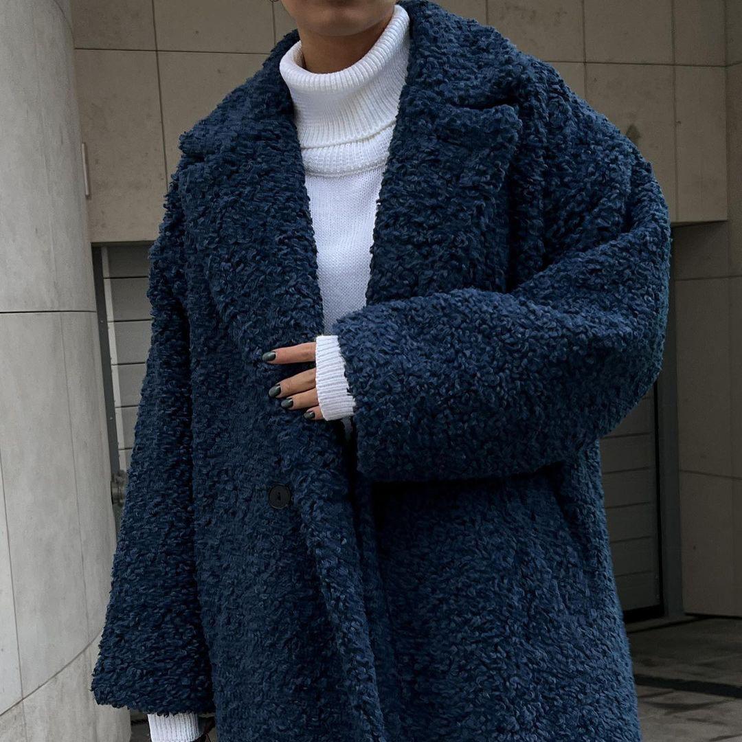 Осеннее и зимнее женское модное элегантное пригородное пальто с длинными рукавами и лацканами, плюшевое пальто XL темно-синий
