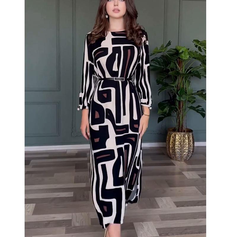 Осеннее модное элегантное темпераментное платье высокого жанра с геометрическим принтом и застежкой на талии